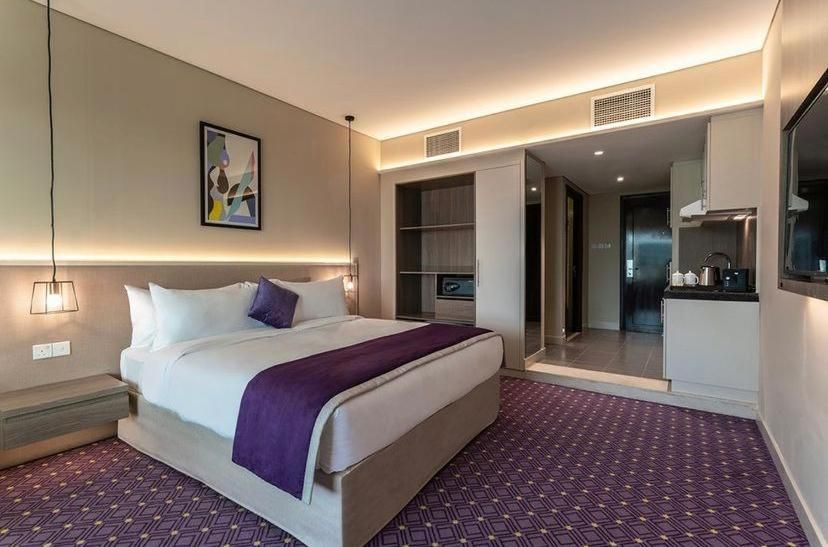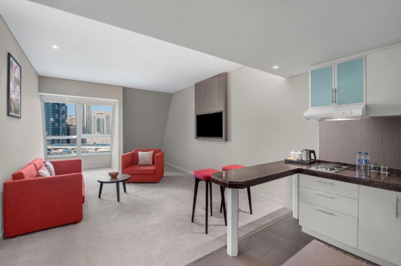 The bright studios, which overlook the atrium, are equipped with a flat-screen TV, safe and kitchenette. Some have a balcony. Upgraded studios, apartments and suites also enjoy views of the city or the Burj Khalifa skyscraper. Some have a separate living room. Wi-Fi is available.